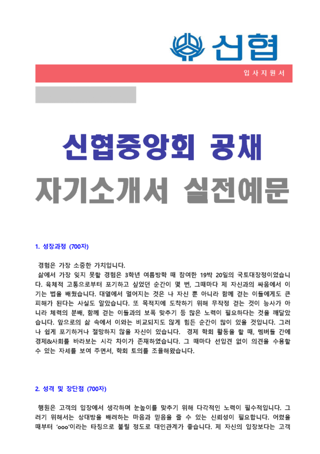 [ 신협중앙회 자소서 본문 中 발췌예문 ]