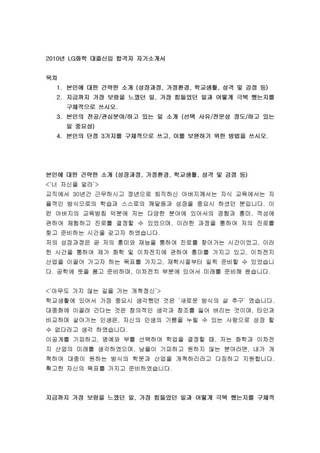 2010년 LG화학 대졸신입 합격자 자기소개서 입니다.