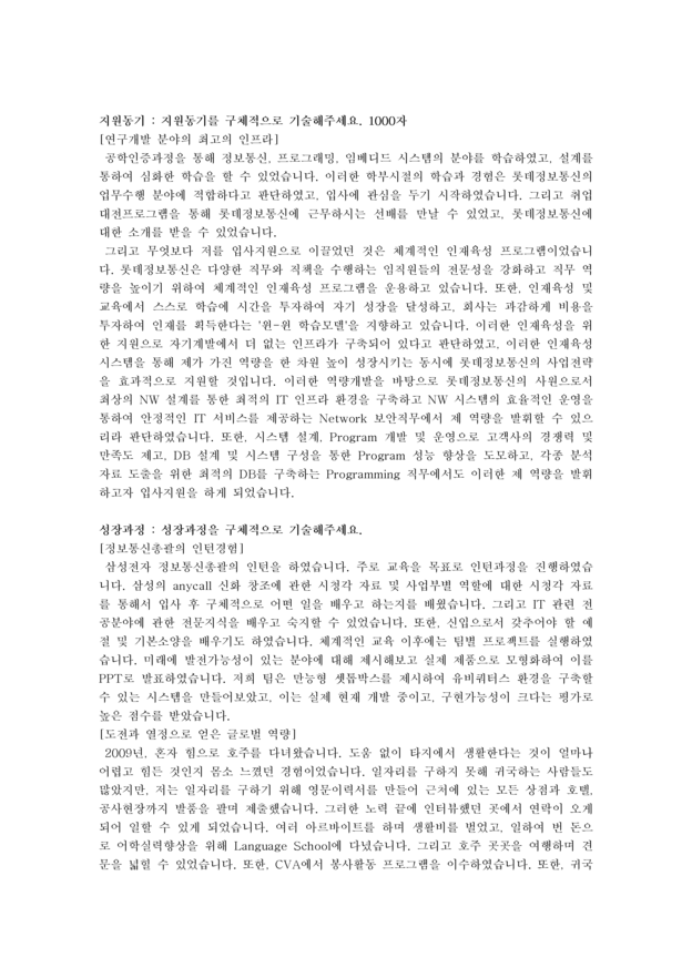 2011년 신입사원이 되기위하여 최선을 다해 작성했던 자기소개서 입니다. 좋은스펙을 가지지 않았지만 잘 쓴 자기소개서 덕분에 서류 합격률이 90%가 넘었구요. 수 많은 면접을 볼 수 있게되어 면접비를 쏠쏠히 챙길 수 있었습니다.^^ 자기소개서를 올리면서 롯데정보통신 면접때 설레였던 그때를 추억해보네요^^ 지금도 취업준비를 하며 제대로 된 자기소개서 찾고 계신 분들께 유용하게 참고가 되길 바랍니다.