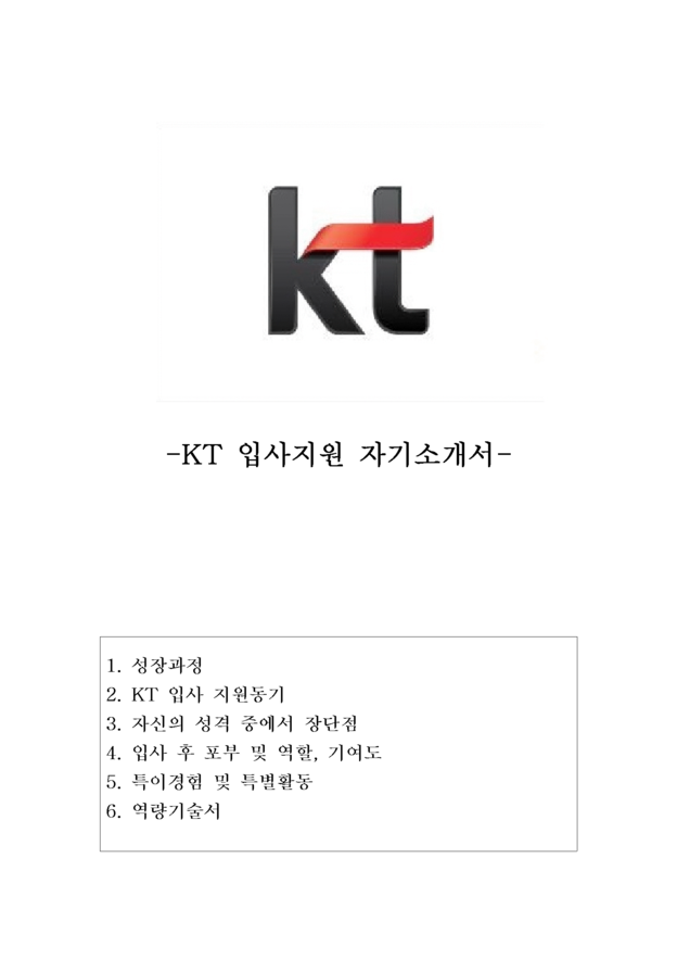 KT에 입사를 희망하는 취업준비자에게 참고되는 자기소개서 예문이다.