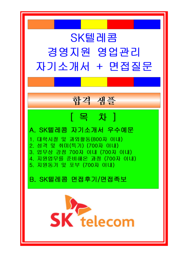 SK텔레콤 경영지원(영업관리) 자기소개서 및 면접족보