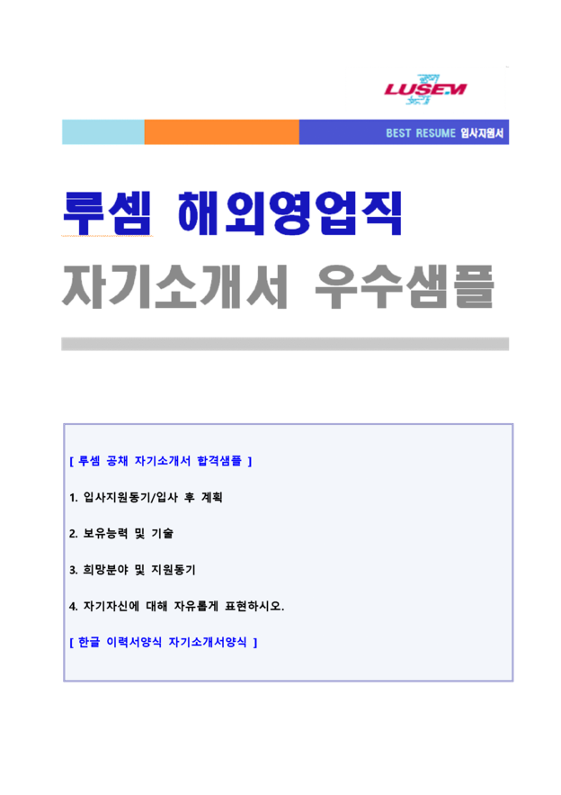 [ 루셈 신입직원/해외영업직 자기소개서 합격샘플 + 이력서양식 – 취업전문가 첨삭서류 ]