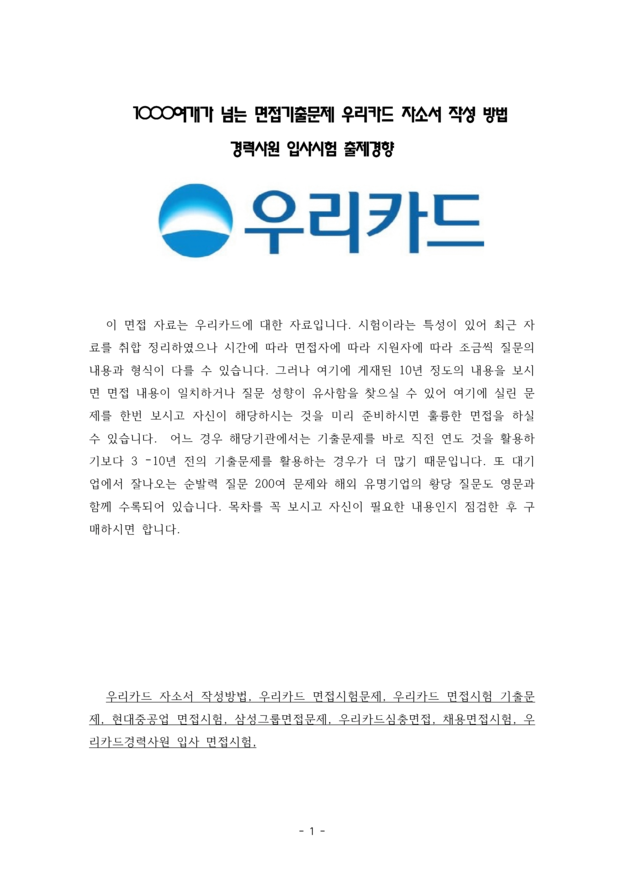 1000여개가 넘는 면접기출문제 우리카드 자소서 작성 방법 경력사원 입사시험 출제경향