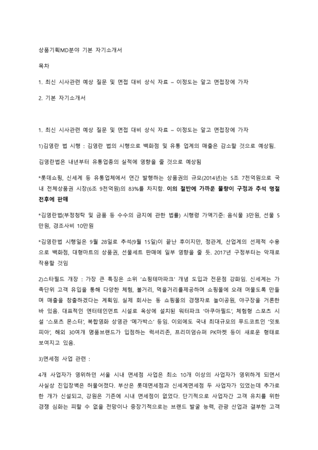 상품기획MD분야 기본 자기소개서입니다. 바탕은 의류업체이지만 MD분야에 지원하고자하는 분들은 자기소개서 정리하는 방법을 익힐 수 있도록 구성하였습니다. 또한 아래 목차처럼 최신 시사관련 테마를 5가지 이상 간단히 담아놓았기때문에 면접에도 대비가 가능합니다. 목차 1. 최신 시사관련 예상 질문 및 면접 대비 상식 자료 – 이정도는 알고 면접장에 가자 2. 기본 자기소개서