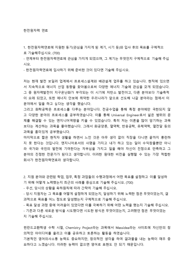 • · 한전원자력연료에 지원한 동기(관심을 가지게 된 계기, 시기 등)와 입사 후의 목표를 구체적으로 기술해주십시오. (700)