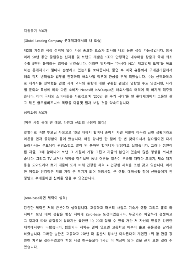 [Global Leading Company 롯데제과에서의 내 모습] 제2의 가정인 직장 선택에 있어 가장 중요한 요소가 회사와 나의 동반 성장 가능성입니다. 창사 이래 50년 동안 끊임없는 신제품 및 브랜드 개발은 1조의 안정적인 내수매출 창출과 국내 최초 수출 5천...…<중 략>