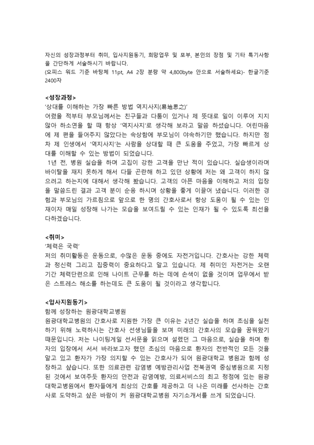 원광대학교병원의 간호사로 지원한 가장 큰 이유는 2년간 실습을 하며 초심을 실천하기 위해 노력하시는 간호사 선생님들을 보며 미래의 간호사의 모습을 꿈꿔왔기 때문입니다. 저는 나이팅게일 선서문을 읽으며 설렜던 그 마음으로, 실습을 하며 환자의 입장에서 서서 바라보고자 했...…<중 략>