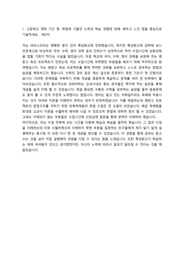 • · 고등학교 재학 기간 중, 학업에 기울인 노력과 학습 경험에 대해, 배우고 느낀 점을 중심으로 기술하세요. 992자