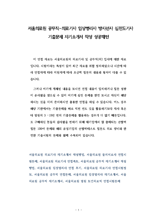 서울의료원 공무직-의료기사 임상병리사 방사선사 심전도기사 기출문제 자기소개서 작성 성공패턴