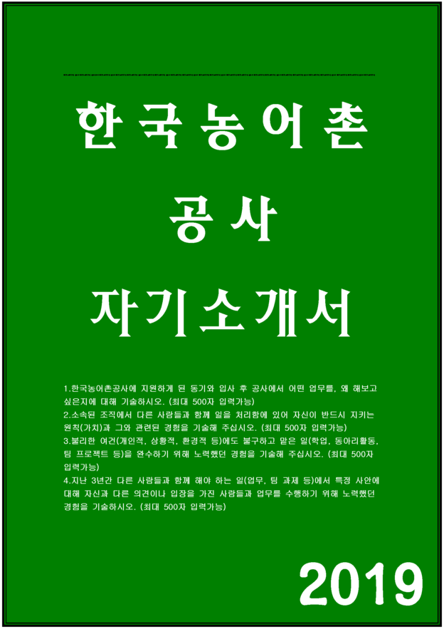 한국농어촌공사 자소서 한국농어촌공사 자기소개서 한국농어촌공사 자소서 한국농어촌공사자기소개서 지원에 필요한 자소서 예문입니다. 한국농어촌공사 자소서에 맞게 자신의 능력과 경험들을 통해 자소서 항목에 맞게 완벽한 자소서를 작성했습니다. 1.한국농어촌공사에 지원하게 된 동기와 입사 후 공사에서 어떤 업무를, 왜 해보고 싶은지에 대해 기술하시오. (최대 500자 입력가능) 2.소속된 조직에서 다른 사람들과 함께 일을 처리함에 있어 자신이 반드시 지키는 원칙(가치)과 그와 관련된 경험을 기술해 주십시오. (최대 500자 입력가능) 3.불리한 여건(개인적, 상황적, 환경적 등)에도 불구하고 맡은 일(학업, 동아리활동, 팀 프로젝트 등)을 완수하기 위해 노력했던 경험을 기술해 주십시오. (최대 500자 입력가능) 4.지난 3년간 다른 사람들과 함께 해야 하는 일(업무, 팀 과제 등)에서 특정 사안에 대해 자신과 다른 의견이나 입장을 가진 사람들과 업무를 수행하기 위해 노력했던 경험을 기술하시오. (최대 500자 입력가능) 한국농어촌공사 지원시 참고하시면 좋은 참고자료가 될 겁니다.