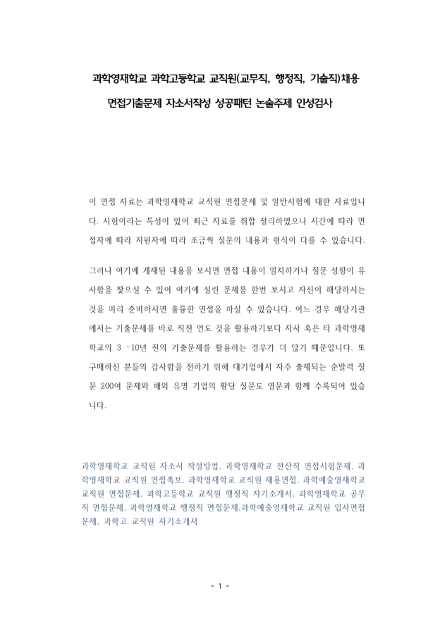 과학영재학교 과학고등학교 교직원(교무직, 행정직, 기술직)채용 면접기출문제 자소서작성 성공패턴 논술주제 인성검사