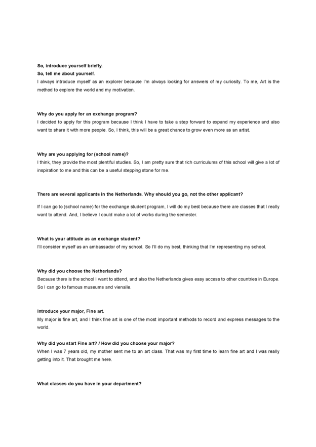 2019년도 네덜란드 미술대학 교환학생 지원합격 영어면접 준비자료입니다. 준비 당시 저도 해피캠퍼스를 통해서 많은 면접자료를 구매했고, 예상질문들을 총정리해서 모으고 답변을 만들었습니다. 너무 문어체나 격식체의 문장들은 조금 편안하게 만들었고, 영어를 잘하지 못하는 편이었기 때문에 뻔한 질문, 사소한 질문까지도 최대한 자세하게 만들었습니다. 기본적인 질문들도 있고, 미술대학 지원에 맞춰진 질문들도 있습니다. 열심히 외워갔고, 실제 면접에서 꽤 많이 질문이 겹쳐서 유용했습니다.