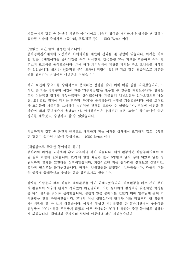 1. 지금까지의 경험 중 본인이 제안한 아이디어로 기존의 방식을 개선하거나 성과를 낸 경험이 있다면 기술해 주십시오. (동아리, 프로젝트 등) 1000 Bytes 이내