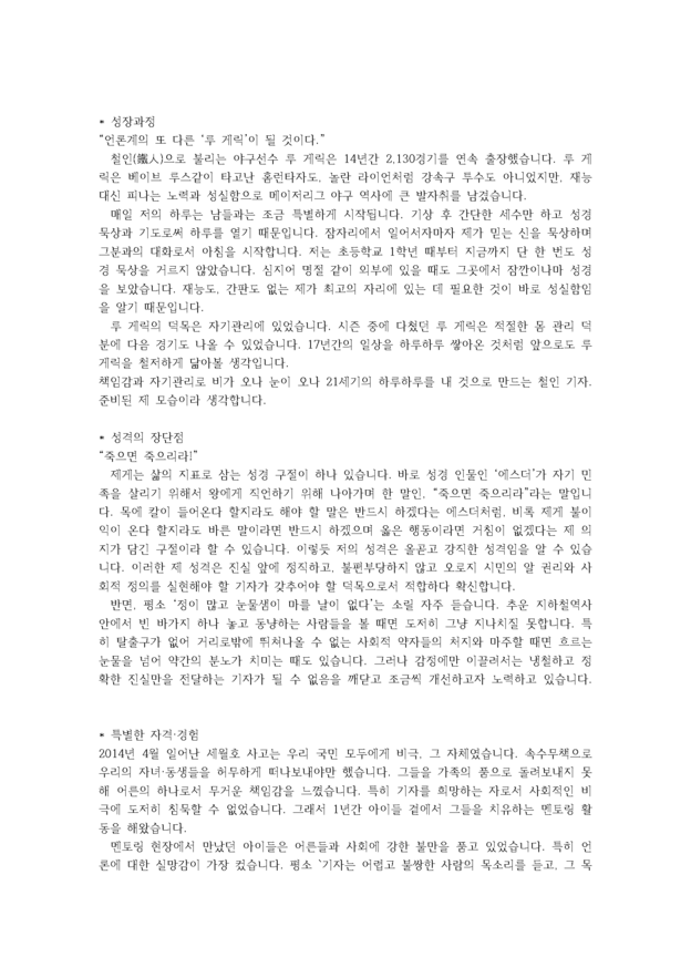 “펜으로 세상에 정의를 실현하자” 제 인생의 최종목표는 ‘세상에 정의를 실현하자’입니다. 정의를 실현하는 데에는 많은 방법이 있을 수 있겠으나 특히 저는 펜으로써 그것을 실현해보고 싶어 기자의 꿈을 키워왔습니다. 사실 조국이 일제로부터 해방돼 오늘에 이르기까지의 우...…<중 략>