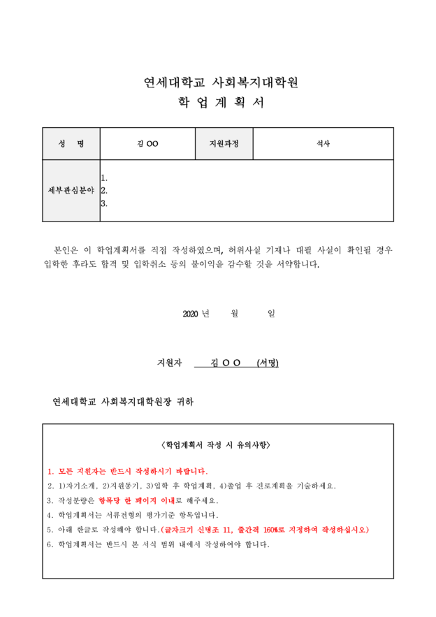 [2021학년도 합격자료] 연세대학교 사회복지대학원(주간) 학업계획서