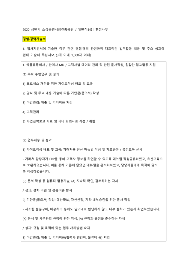 2020 상반기 소상공인시장진흥공단(일반행정, 사무5급) 합격 자소서입니다.