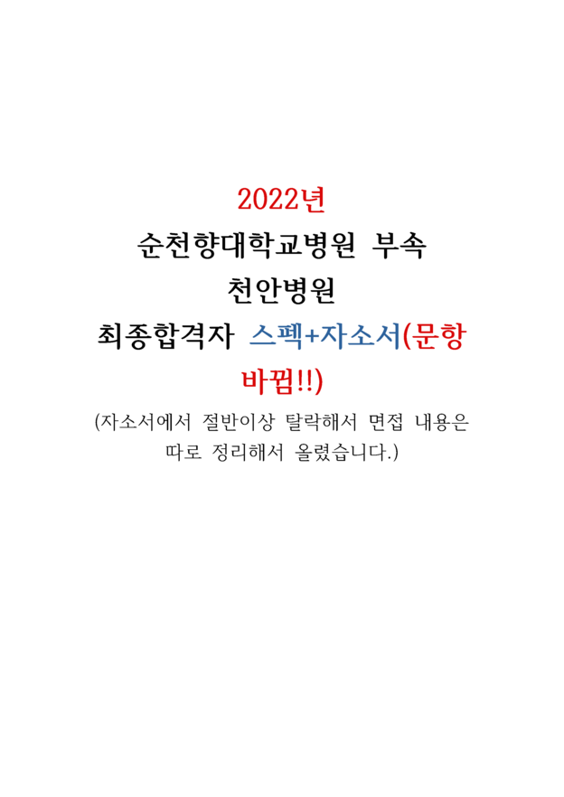 "2022년도 천안순천향대학교병원 최종합격자 스펙+자기소개서"에 대한 내용입니다.