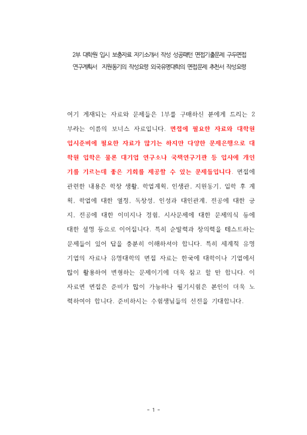 위의 붉은색 몇 질문은 전형적인 꼬리 질문의 사례 입니다. 어떻게 문항이 진행되는지 잘 생각하셔서 미리 준비하셔야 합니다. 잘 모르면 아주 처음부터 잘 모른다고 하고 만약에 자신이 있으면 당당하게 소신껏 끝까지 대답하세요. 예제와 동일한 문제가 출제되어 답변을 잘하셨다면 물론 합격에 무척 가까이 가실수 있습니다. 문제는 다른것이 출제 될수 있으나 답변을 잘하시면 아주 합격에 가까이 갈수 있는 꼬리질문의 사례입니다. 그러기 위해서 한가지 정도 사례를 가지고 집중적으로 알아보고 가는것도 권합니다. 물론 해당 사항이 지원한 대학원의 사례라면 더욱 좋겠지요? 문항의 성격을 잘 파악해 보시면 아시겠지만 질문 깊이와 내용 그리고 방향이 어떠한가를 아실수 있습니다. 다른 문제도 이와 유사한 형식으로 출제 될수 있습니다. 또 대학원의 연구자로서 혹은 협동과정에 입학하시려면 적어도 해당학과 교수님들의 논문 몇 개는 읽어 보시고 최소한 결론 부분에 연구에 미흡한점, 향후 연구추천방향 정도는 알고 가시면 매우 좋습니다. 면담때 다른 어려운 질문 피하고 해당 논문에 대해서 아는척 하면 그에 대한 토론을 집중하기도 하고 호감도 많이 살수 있습니다.