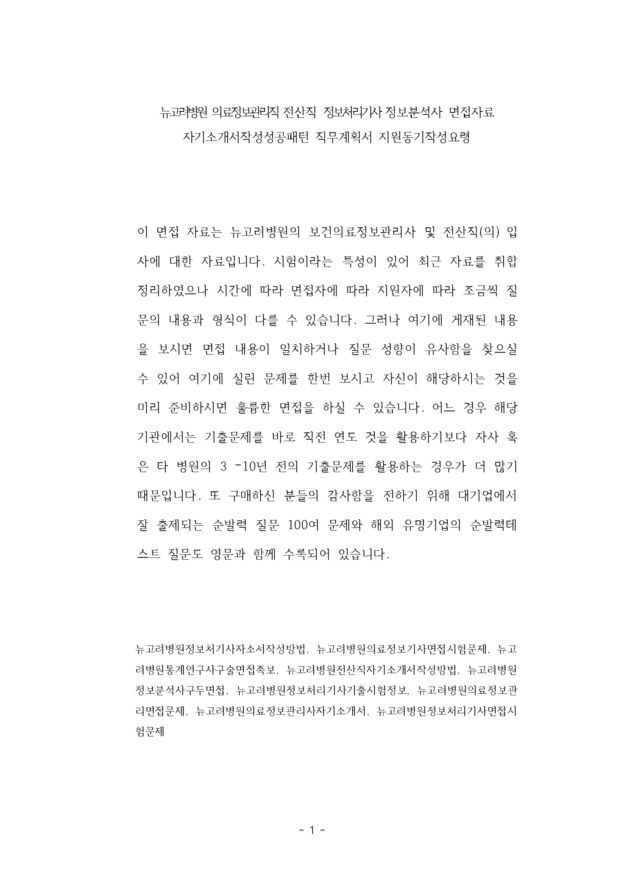 뉴고려병원 의료정보관리직 전산직 정보처리기사 정보분석사 면접자료 자기소개서작성성공패턴 직무계획서 지원동기작성요령