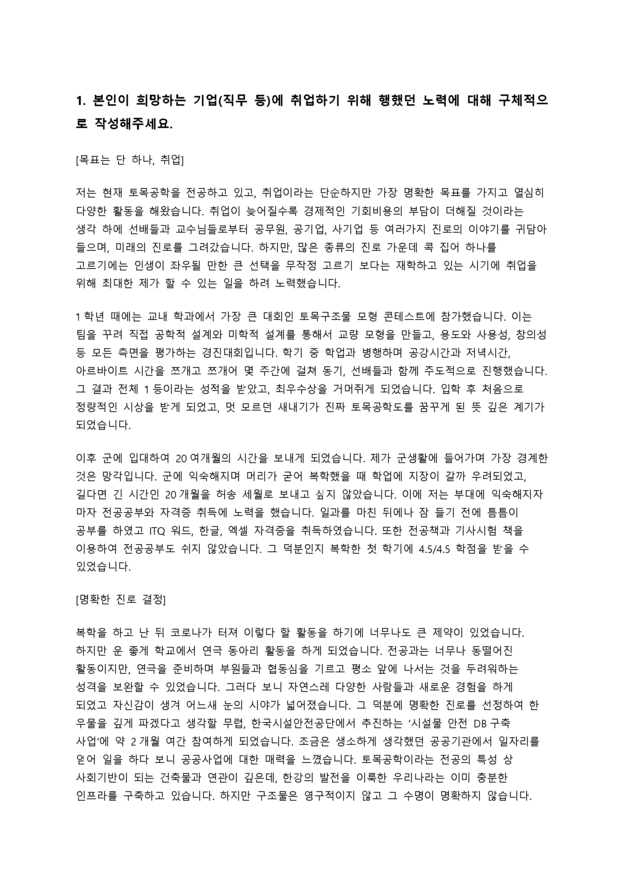 [목표는 단 하나, 취업] 저는 현재 토목공학을 전공하고 있고, 취업이라는 단순하지만 가장 명확한 목표를 가지고 열심히 다양한 활동을 해왔습니다. 취업이 늦어질수록 경제적인 기회비용의 부담이 더해질 것이라는 생각 하에 선배들과 교수님들로부터 공무원, 공기업, 사기업 ...…<중 략>