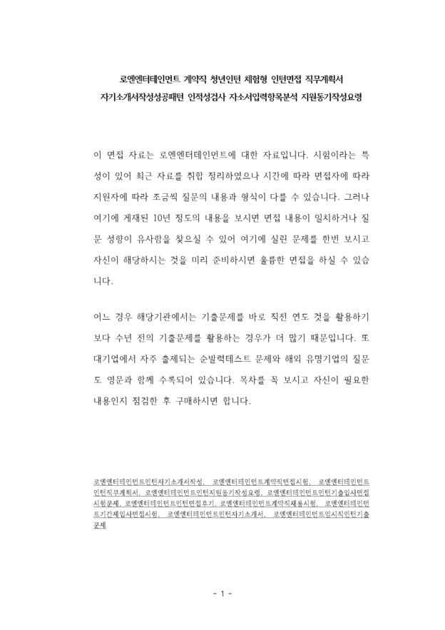 로엔엔터테인먼트 계약직 청년인턴 체험형 인턴면접 직무계획서 자기소개서작성성공패턴 인적성검사 자소서입력항목분석 지원동기작성요령