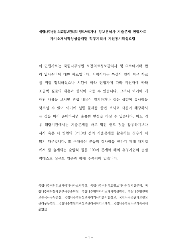 국립나주병원 의료정보관리직 정보처리기사 정보분석사 기출문제 면접자료 자기소개서작성성공패턴 직무계획서 지원동기작성요령