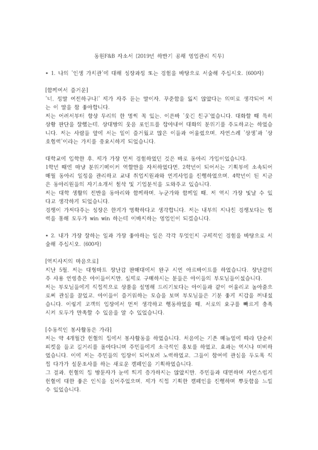 동원F&B 서류합격 자기소개서 (2019년 하반기 공개채용 영업관리직무)