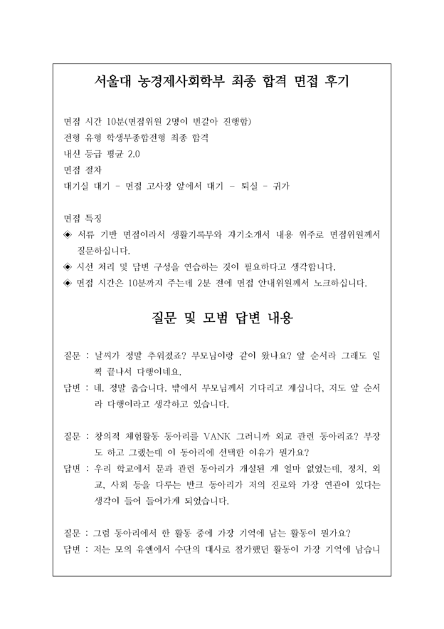 1. 서울대 농경제사회학부 최종 합격 면접 후기