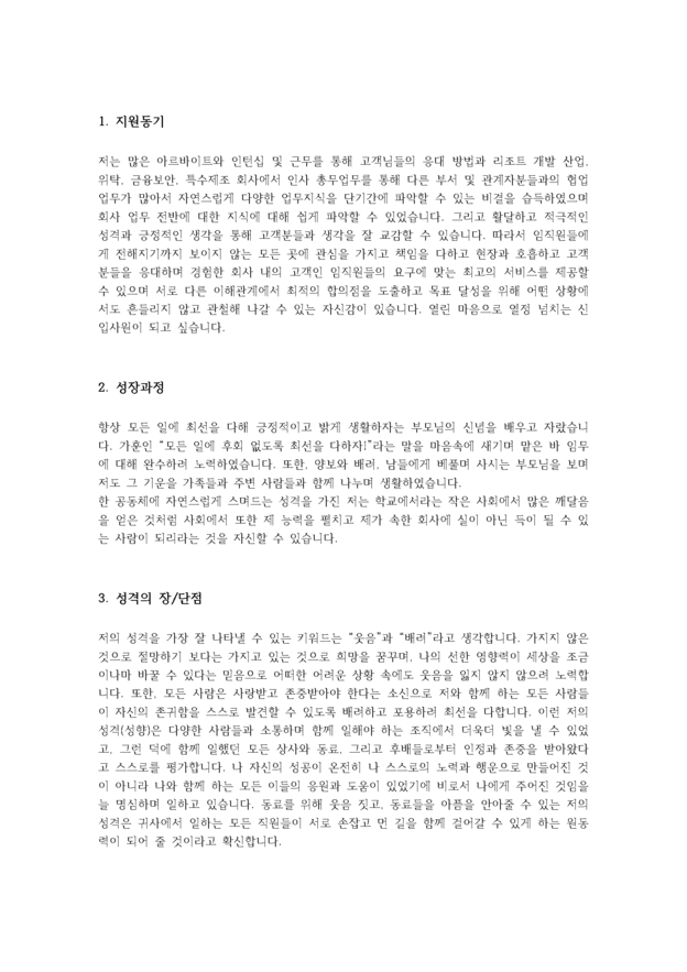 저는 많은 아르바이트와 인턴십 및 근무를 통해 고객님들의 응대 방법과 리조트 개발 산업, 위탁, 금융보안, 특수제조 회사에서 인사 총무업무를 통해 다른 부서 및 관계자분들과의 협업 업무가 많아서 자연스럽게 다양한 업무지식을 단기간에 파악할 수 있는 비결을 습득하였으며 ...…<중 략>