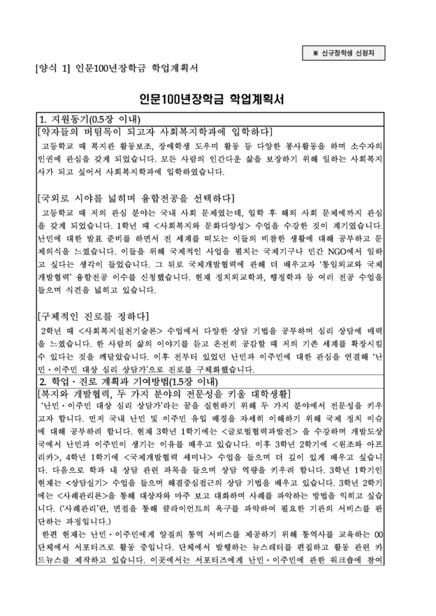 인문 100년 장학금 학업계획서 (전공확립 1유형 선정)