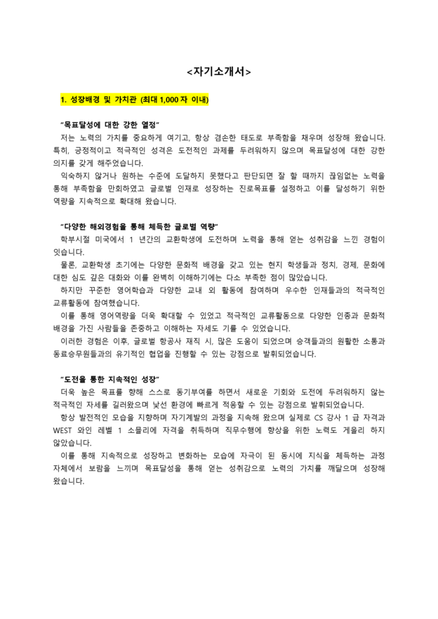 1. 성장배경 및 가치관 (최대1,000자 이내)