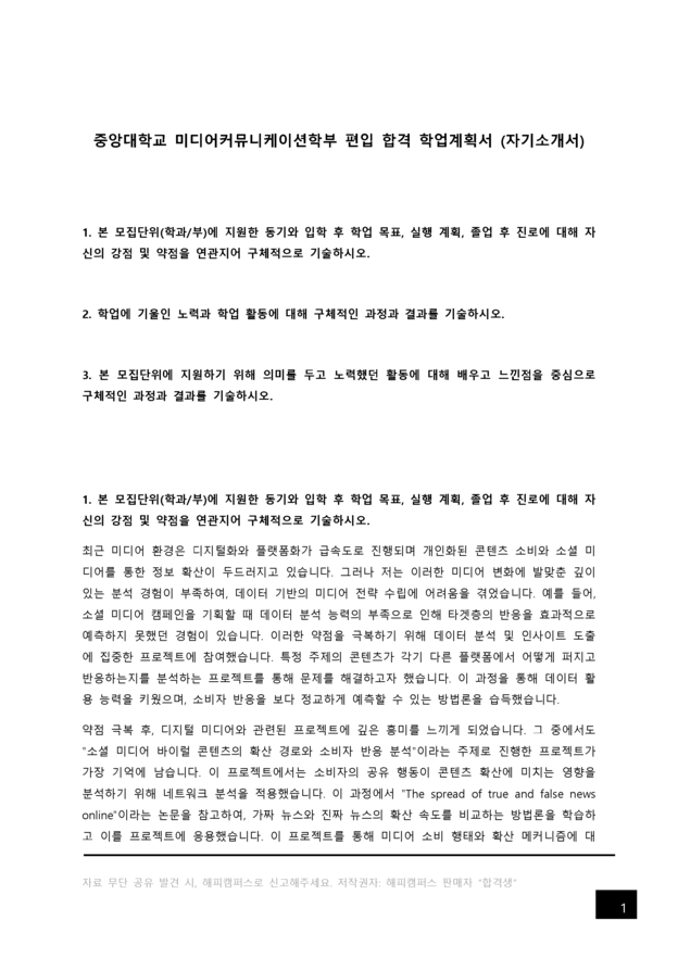 중앙대 미디어커뮤니케이션학부 편입 합격 학업계획서 (자기소개서), 중앙대학교 사회과학대학 일반 편입 우수 자소서 합격 후기, 지원 동기, 졸업 진로 계획