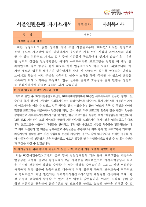 3. 기관이 추구하는 이념과 가치를 반영한 자기소개서 입니다.