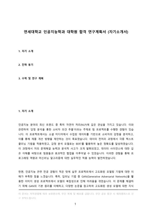 "연세대 인공지능학과 AI 대학원 합격 자기소개서 연구계획서 (학업계획서, 수학계획서), 연세대학교 인공지능융합대학 인공지능 대학원 우수 합격 자소서 원서 연대 지원 동기, 졸업 진로 계획"에 대한 내용입니다.
