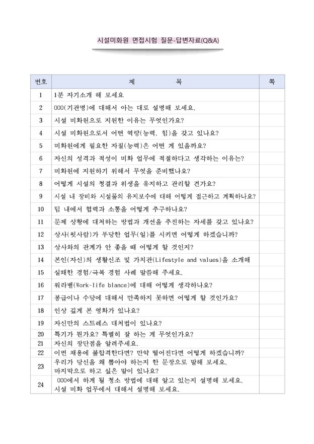 시설미화원(환경미화원) 면접시험 질문 답변 예상자료('24.12. 합격)
