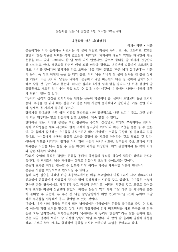 "운동화를 신은 뇌 감상문 1쪽, 요약문 9쪽"에 대한 내용입니다.